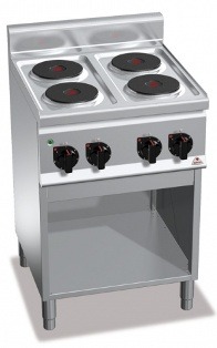 Darbo ir priekiniai paviršiai iš nerūdijančio plieno AISI 304. Apvalios 4 ketaus kaitlentės Ø 180 mm, kiekviena po 2 kW, su kaitinimo elementais, kurie hermetiškai įlituoti. 6 perjungimo padėtys. Apsaugos termostatas. Įjungimo ir darbo būvio davikliai. Užapvalinti kraštai. Bortelis nuo taškymosi. Reguliuojamos kojelės. Atvira spintelė.