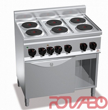 Darbo ir priekiniai paviršiai iš nerūdijančio plieno AISI 304. Apvalios 6 ketaus kaitlentės Ø 180 mm, kiekviena po 2 kW, su kaitinimo elementais, kurie hermetiškai įlituoti. 6 perjungimo padėtys. Apsaugos termostatas. Įjungimo ir darbo būvio davikliai. Užapvalinti kraštai. Bortelis nuo taškymosi. Nerūdijančio plieno elektrinė konvekcinė orkaitė su 3 lygių kreipiančiosiomis (GN 1/1 530х325 mm), 20/10 nerūdijančio plieno karščiui atspari durų rankena. Komplekte 1 grotelės GN1/1.
