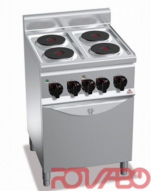 Darbo ir priekiniai paviršiai iš nerūdijančio plieno AISI 304. Apvalios 4 ketaus kaitlentės Ø 180 mm, kiekviena po 2 kW, su kaitinimo elementais, kurie hermetiškai įlituoti. 6 perjungimo padėtys. Apsaugos termostatas. Įjungimo ir darbo būvio davikliai. Užapvalinti kraštai. Bortelis nuo taškymosi. Nerūdijančio plieno elektrinė konvekcinė orkaitė su 3 lygių kreipiančiosiomis (GN 1/1 530х325 mm), 20/10 nerūdijančio plieno karščiui atspari durų rankena. Komplekte 1 grotelės GN1/1.