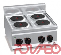 Darbo ir priekiniai paviršiai iš nerūdijančio plieno AISI 304. Apvalios 4 ketaus kaitlentės Ø 180 mm, kiekviena po 2 kW, su kaitinimo elementais, kurie hermetiškai įlituoti. 6 perjungimo padėtys. Apsaugos termostatas. Įjungimo ir darbo būvio davikliai. Užapvalinti kraštai. Bortelis nuo taškymosi. Statoma ant stalo.