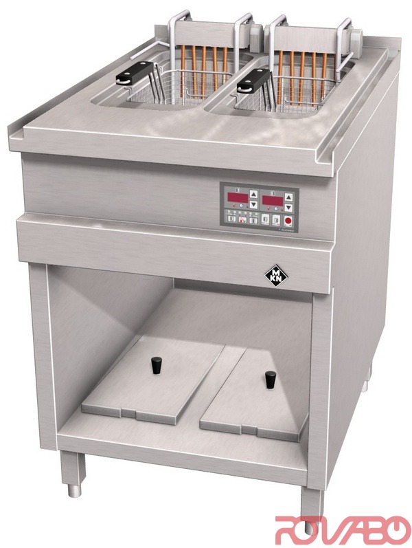 Korpusas pagamintas iš nerūdijančio plieno (304). 2 kepimo vonios talpinančios 12,5 litrų. Suvirinta be siūlių viršutinė plokštė su šoniniais nutekėjimo grioveliais. Lengvai valoma. Cilindriniai kaitinimo elementai pagaminti iš nerūdijančio plieno. Aušinimo zona. Vonios išmatavimai: 180x400x235 mm. Krepšelių pakelėjas su laikmačiu. Elektroninis temperatūros reguliavimas "EcoControl". Įrenginys paruoštas prijungimui prie energiją optimizuojančios sistemos. Pagrindinis jungiklis, termostatas, ventiliatorius, temperatūros apsaugos termostatas, kontrolinė lemputė, apsaugos klasė IPX5. Komplekte: 2 dangčiai, 2 vonelės aliejaus valymui, 2 krepšeliai.