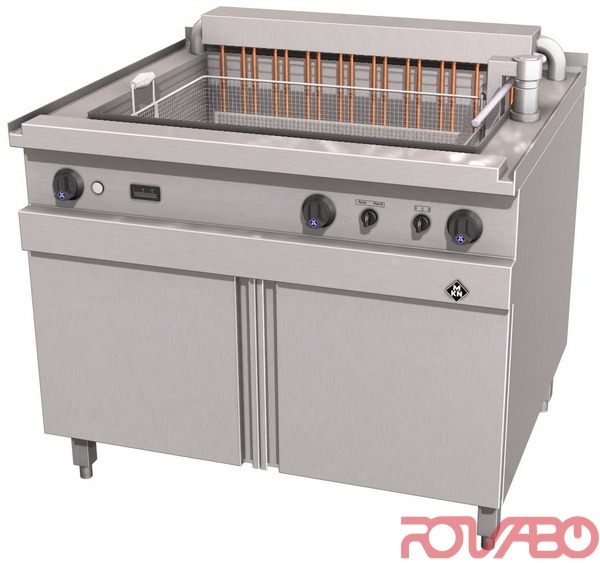 ТЭНы из хромоникелевой стали, малая поверхностная нагрузка для более продолжительной работы с жиром/маслом, ванна с глубокой охлаждающей зоной. Нагревательные элементы можно целиком доставать их ванны за крепёжный кронштейн с автоматическим выключением, а также для упрощения очистки. Подходит для выполнения повседневных задач на кухне объекта общественного питания, отличается надёжностью и прочностью. Механизм подъёма корзины - стандарт. Подъёмный двигатель справа . Имеется подключение к системе оптимизации электропитания с беспотенциальным контактом (стандарт), с плавающим выходным контактом и контактом для пожаротушения для активации системы пожаротушения. Класс защиты IPX 5. Крышка, жиросборник, 1 корзина, 4 съёмные ножки h150 мм с регулировкой по высоте +/– 15 мм.