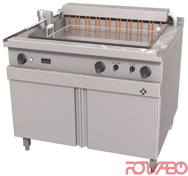 Chrome nickel steel tubular heating elements with a low surface load for longer lasting fat, basin with deeper, cool zone. Heating elements can be raised completely out of the frying basin, with holding bracket and automatic cut off, incl. for easy cleaning. Suited to the every day needs of industrial kitchens, robust and reliable. Basket lifting mechanism as standard. Lifting motor left. Equipped for connection to a power optimization system with potential free contact as standard and floating output contact and “fire extinguisher contact” to activate a fire extinguishing system. IPX 5. Lid, oil clarifying tray, 1 basket G, 4 appliance feet, 150 mm high, pluggable +/– 15 mm height adjustable.
