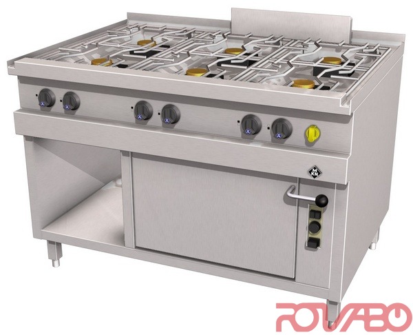 Korpusas pagamintas iš chromo-nikelio plieno. 6 degikliai: 3х3,5 kW, 1x5.6 kW ir 2x7 kW. Orkaitė - 5,6 kW. Viršutinė plokštė be siūlių su nutekėjimo grioveliais. Legiruotojo plieno degikliai, (70 mm). Žemo slėgio degiklis, uždegimo degiklis, termoelektrinis saugiklis, dujų degiklio kranelio išjungėjas. 3 nuimamos grotelės iš nerūdijančio plieno. Temperatūrinis režimas nuo 50-300°C. Tiesioginis viršutinis kaitinimas. Apatinis kaitinimas reguliuojamas termostato su kontroline lempute, kontroliniu perjungėju ir temperatūros saugos termostatu. Komplekte: 1 kepimo skarda GN2/1, 1 grotelės iš n/p GN2/1.