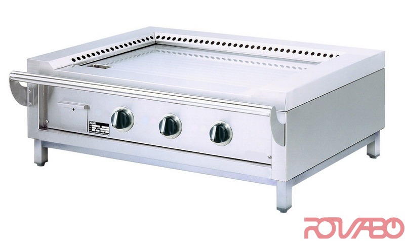 Mild steel FE 510 construction. Cooking surface 1200x550 mm. Construction in “sandwich” with isolation plate of 10 mm thick for the retention of heat and energy. Gas valve integrated with security pilot flame. On three sides chimney with holes for gas evacuation. Equipped with hand rail surrounding for safety purpose. Big waste chute complete with waste collection drawer.