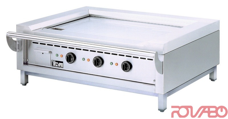 Mild steel FE 510 construction. 3 individual controlled thermostats. Cooking surface 1200x550 mm. Construction in “sandwich” with isolation plate of 10 mm thick for the retention of heat and energy. Equipped with hand rail surrounding for safety purpose. Drawer for residues.