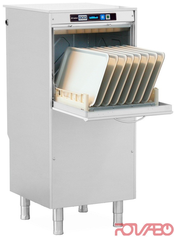 Tank capacity 34 l . Boiler capacity 5 l . Water consumption: Cycle water consumption 2,6 litres. Water connection: Temperature 45-55ºC. Pressure 2-4 Bar. Stainless steel construction AISI 304 18/10 . Wash arms in stainless steel. Wash programmes: cycle 2, 3, 4 minutes. Soft touch electronic control panel. New control panel with interactive graphic display. Temperature’s electronic display. Insulated double skin. Cycle start with soft-start system. Integral tank drawer filters. Extractable control panel for an easy maintenance. Rinse aid dispenser. Automatic tank loading. Door opening safety device. Thermocontrol: device which guarantees the selected temperature for every rinsing cycle even in case of nonstop work. Economy thermostat. Washing capacity 30 baskets/h . Basket size 500x500 mm. Working height 850 mm. Clearance 400 mm. 2 baskets for 12÷18 dishes in plastic, 1 general basket in plastic, 2 cutlery containers in plastic.